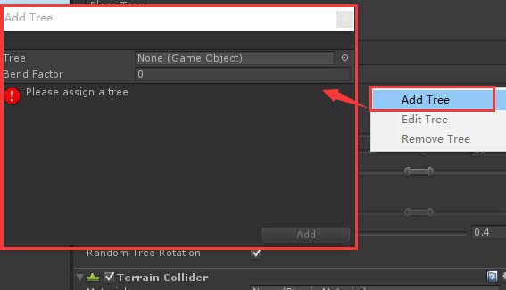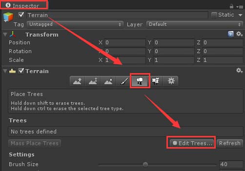 5、树木资源包导入完成后,在Hierarchy视图选中“Terrain(地形)”,点击Inspector视图中树木图标,然后点击“Edit Trees”按钮,如下图所示。