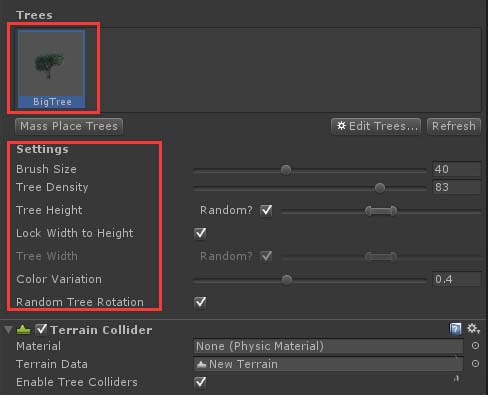 8、完成树木的选择后,可以看到Inspector视图中的Trees一栏中对应选择的树类型,通过更改Settings选项来设置绘制树时画笔的大小(Brush Size)、树的密度(Tree Density),树的高度(Tree Height)等等。