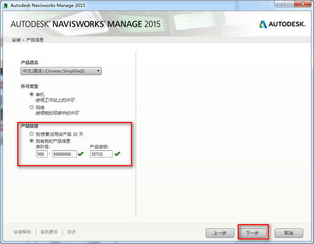 4、输入序列号:066-66666666,产品密钥:507G1,点“下一步”。
