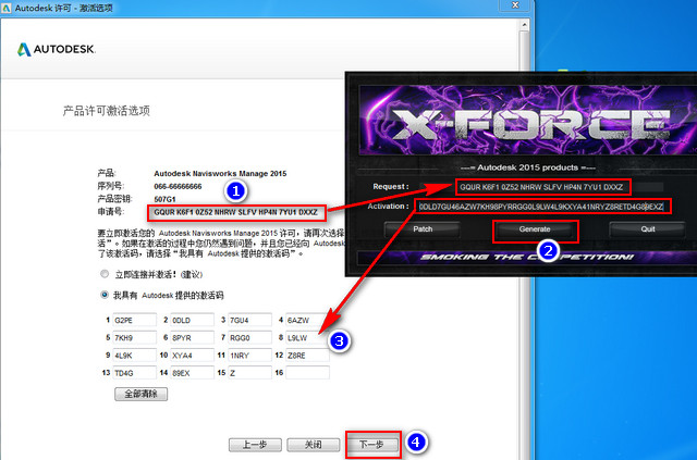11、把软件申请号复制到注册机的第一栏,然后点击“Generate”,生成激活码,把注册机第二栏生成的激活码,复制到激活选项的一组文本框里,点击“下一步”(如下图所示:)。