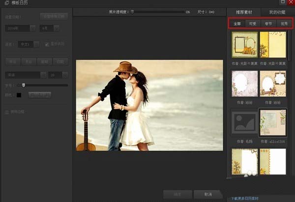 2、进入模板日历之后,在右边可以看到一系列推荐的素材,同时,你也可以在“我的收藏”中调取本地自己收藏的素材。