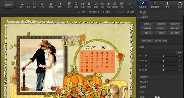 1、用光影魔术手打开你的一张照片,在功能栏中可以看到“日历”这一功能,在下拉框中选择“模板日历”。