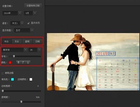 8、将年份、月份、日期按自己的爱好排版好,然后在左边的编辑框中分别对“年份”“月份”“星期”“日期”等分别进行点击编辑,可以改变字体、颜色等等,也可以为日期加上边框,使日历更加美观。