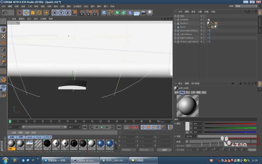 1、打开一个带有灯光、场景及材质球的c4d源文件。