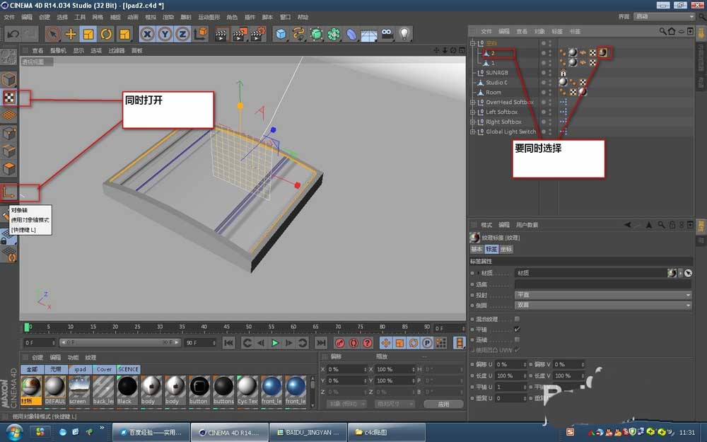 7、这步较为关键,需要同时选中模型和材质球,然后在左边的对话框里同时选择“纹理模式”和“对象轴”。这样的话就可以精确控制下面的旋转角度。