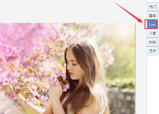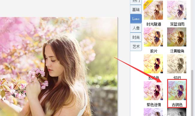 6、点击LOMO选项,在其内找到古铜色选项,如图所示: