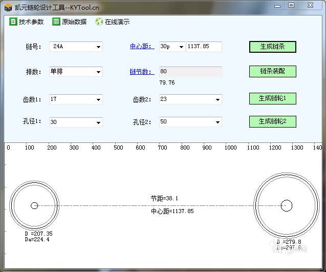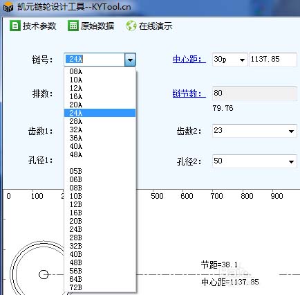 4、选择链号,从08A到48A,从05B到72B,这些都是国家标准,可以在“原始数据”窗口中查看每一个链号的参数。