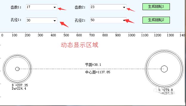 6、输入小链轮的齿数,孔径,大链轮的齿数,孔径,可以从下拉列表中选,如果没有选项的话也可以手动输入,输入数据后下方的显示区域会动态显示外观样式。