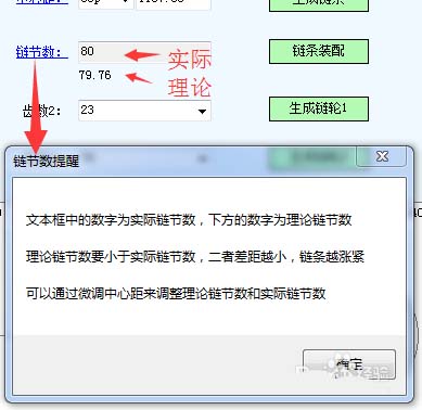 8、指定中心距后,链节数会发生变化,如下图所示,文本框中显示的是实际链接数,下方的文本显示的是理论链接数。实际链节数要略大于理论节数,这样安装时才能宽松,否则太紧,装不上去。
