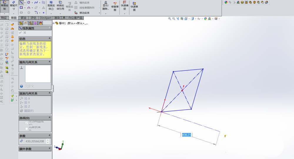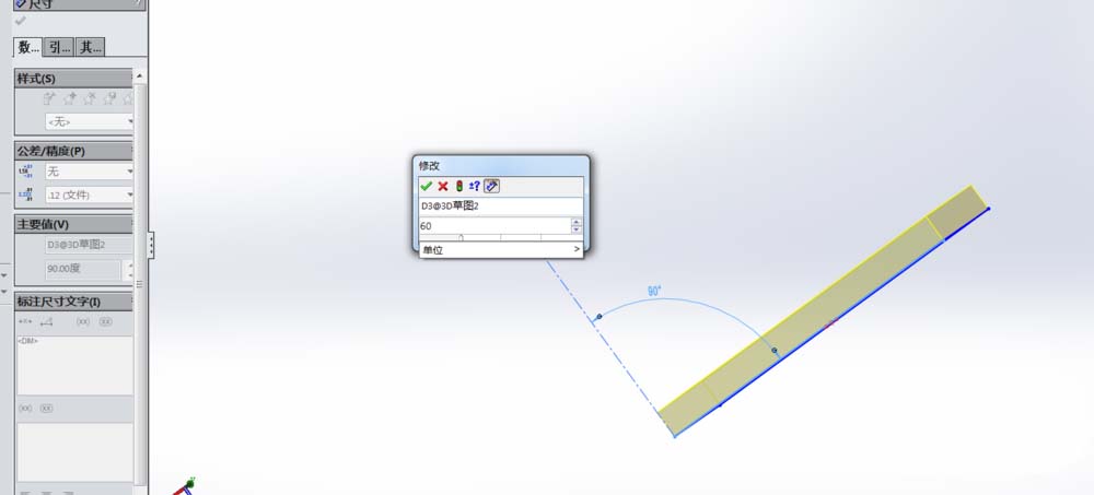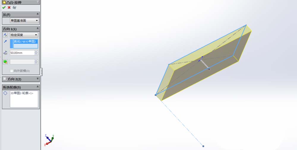 4、退出草图,点击拉伸凸台,所选轮廓为矩形,方向为另一条构造线,此时的拉伸凸台和2D草图的拉伸凸台是一样的。随后编辑草图,捕捉到作为方向构造线的角度尺寸,均改为60°。