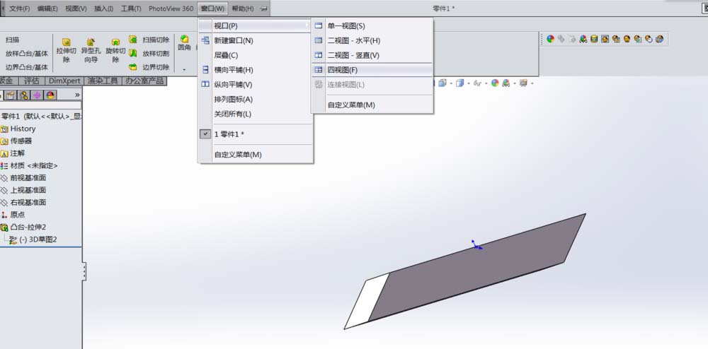 5、退出3D草图,此为3D草图下可以完成的凸台。为了更直观一些,小编点击了窗口命令下的视口命令,然后选择四视图。