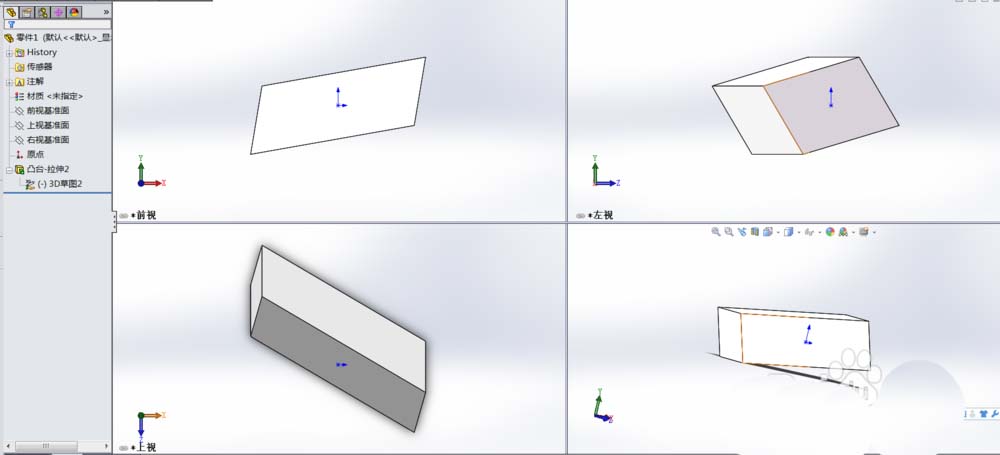 6、在四视图的窗口下,我们更直观的看到3D草图下绘制的凸台。