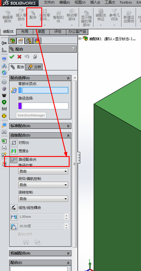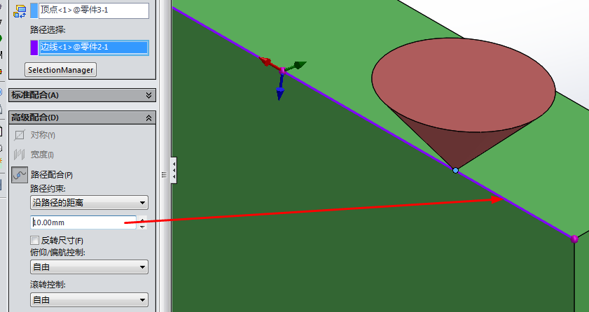 solidworks路径配合可以使顶点绕着规定的路径运动,路径配合的要素:1.零件顶点2.一条路径,直线,曲线。