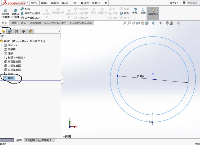 2、我们需要打开solidworks,选择零件选项绘制一个完整且封闭的草图,退出草图绘制,然后在设计树内点击草图,选中草图。