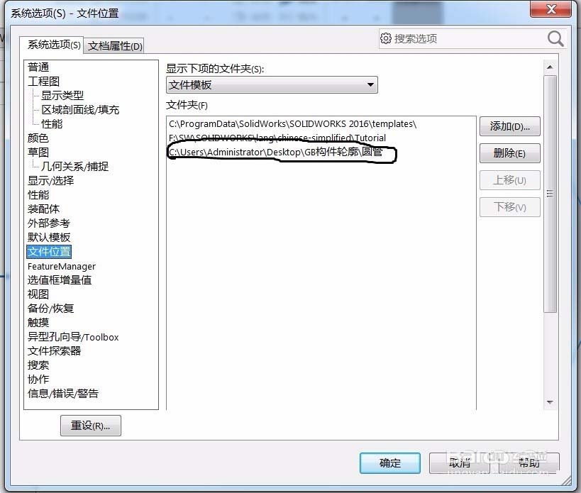 3、点击工具按钮,选择选项,进入选项后选择文件位置,点击添加,选择新建构件轮廓所在文件夹位置。点击确定。