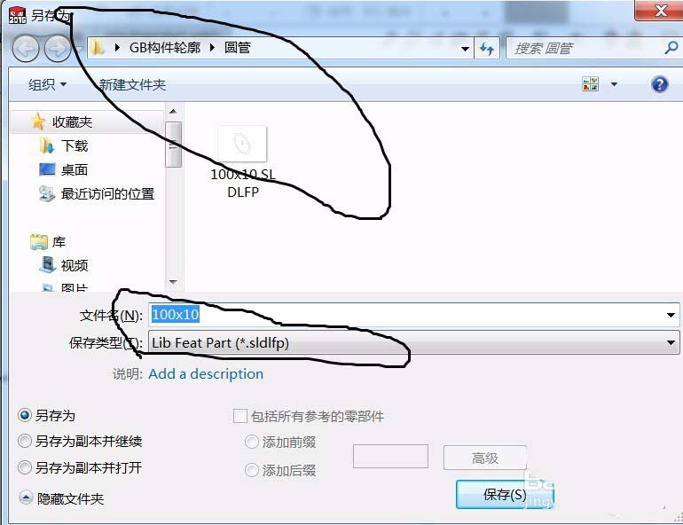 4、将草图保存到新建文件夹的子文件夹内,保存格式更改为Lib Feat Part(*.sldlfp)。注意创建成功后设计树内图标的变化。
