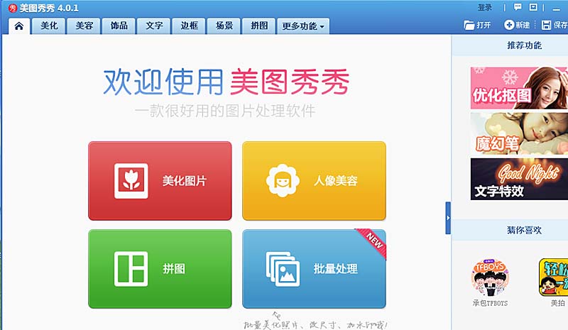 1、打开电脑,打开美图秀秀软件,进入美图秀秀图片处理软件。在美图秀秀操作页面上,点击“打开”。