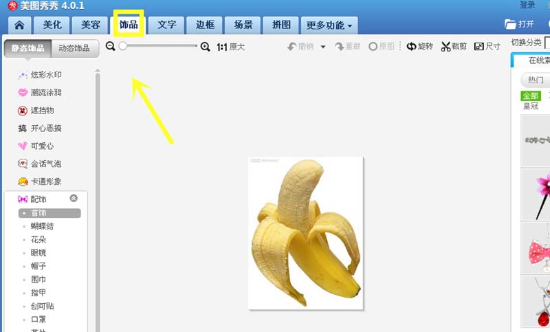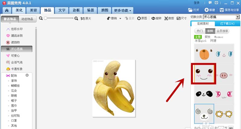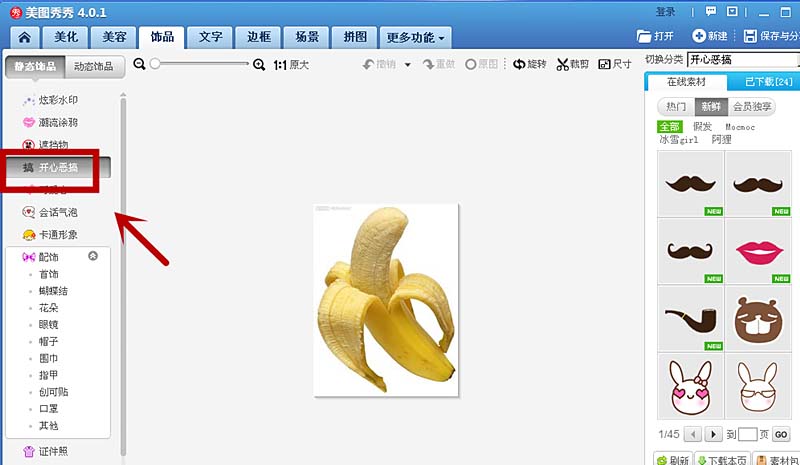 4、图片打开后,选择【饰品】中的【开心恶搞】对图片进行装饰。
