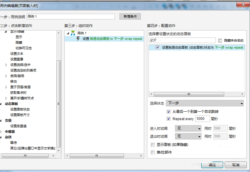 3、此时再对整个页面载入时添加一个效果,令刚刚的动态面板在载入时就不断的从头循环,反复切换状态,时间间隔设置好为1000ms,即一秒;此外还需对系统的临时变量OnLoadVariable进行第一次赋值:60
