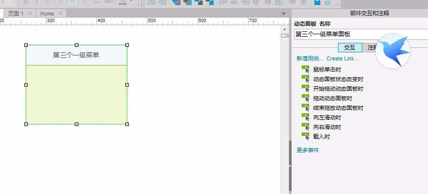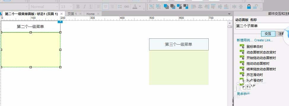 4、下面我们来做第二个一级菜单,同样的制作原理与步骤与第三个一级菜单与子菜单一致,但需要把刚刚做好的动态面板一并放置在同一页面,以便后续操作;