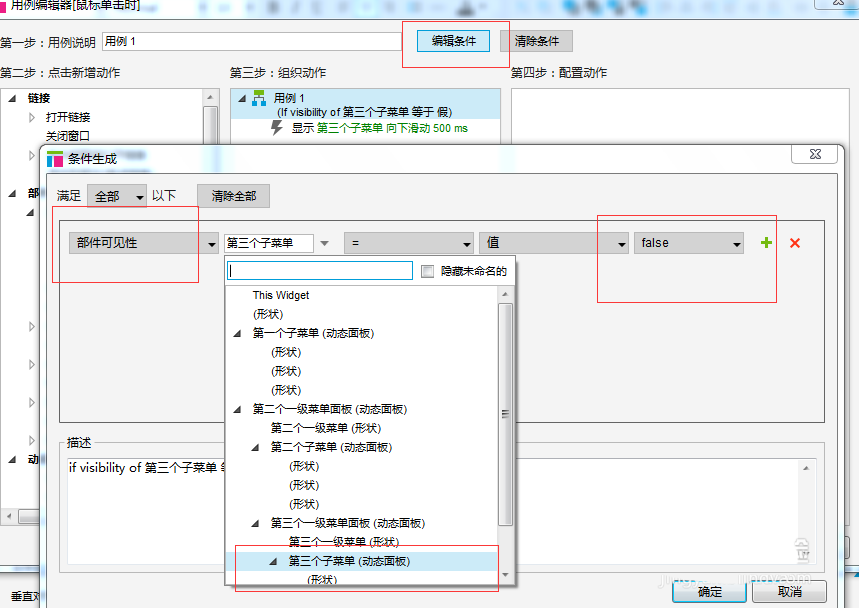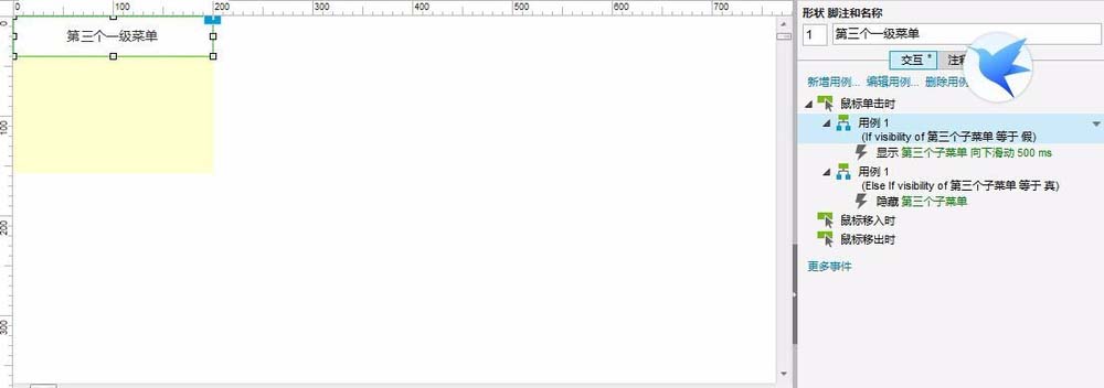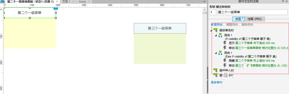 5、此时对第二个一级菜单做点击事件的添加:当子菜单面板是隐藏的时候,点击后可显示子菜单;当子菜单是显示的时候,点击后可隐藏子菜单。但与前一个一级菜单相比,需多加一个效果,即移动第三个一级菜单的动态面板,移动距离以子菜单的高度*子菜单数量,比如我例子中用的是三个高40的子菜单,则需分别对y坐标移动+/-120;