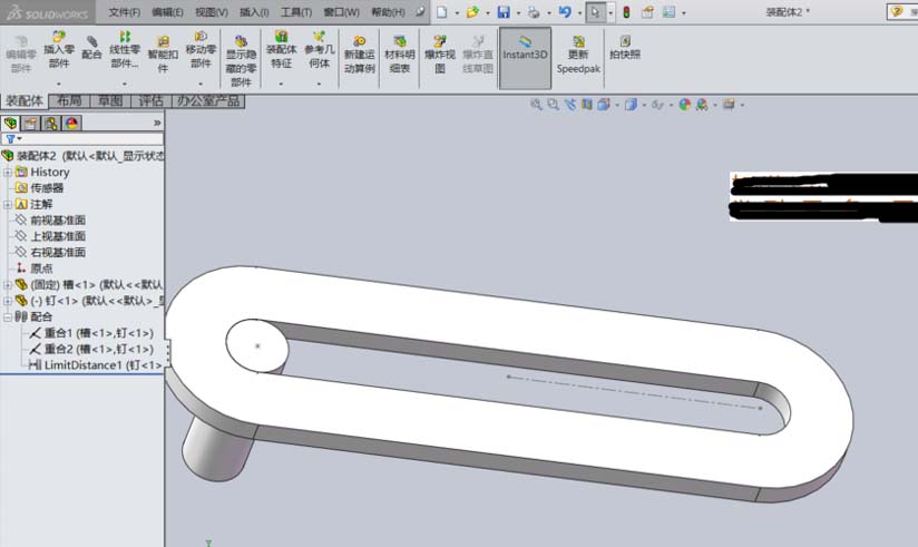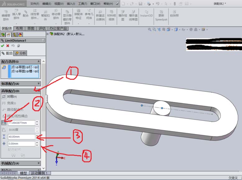 3、此时点击配合,选辅助点和辅助线的端点,点①处高级配合,点②处,设置③参数最大距离,设置④处最小距离,完成配合。