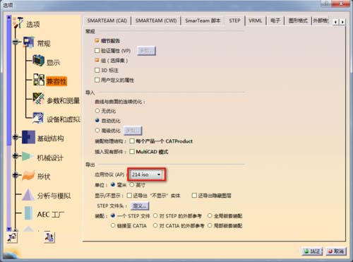 3、设置界面打开后,点击左侧“常规”——“兼容性”,然后从界面上部找到选项卡“STEP”,将导出选项下的应用协议(AP):更改为"214iso",点击右下角确定,就可以了。赶快试试吧。