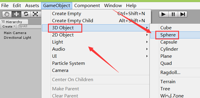 3、点击gameobject菜单在其子级菜单里找到3d object选项,点击该选项在其下拉菜单里找到sphere选项,如图所示: