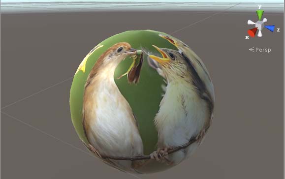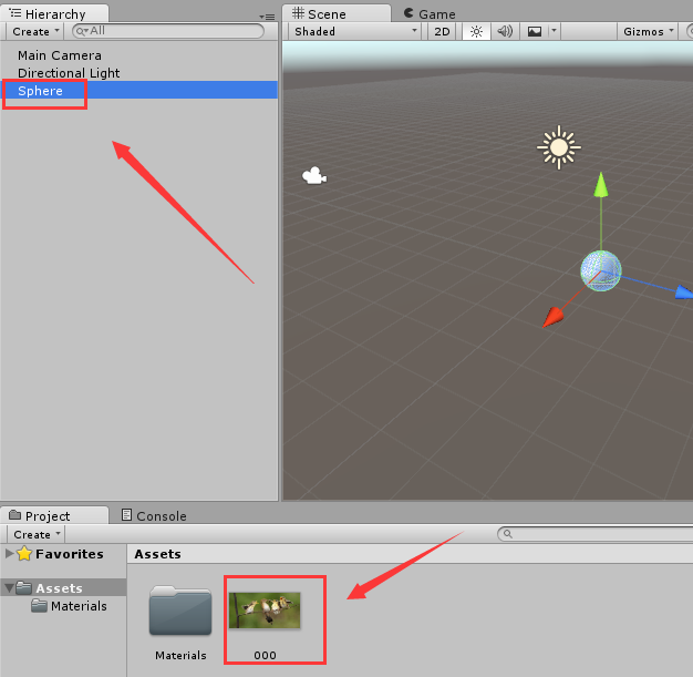 5、在assets内找到一张材质图,使用鼠标左键将其拖拽到刚刚创建的sphere物体上,如图所示: