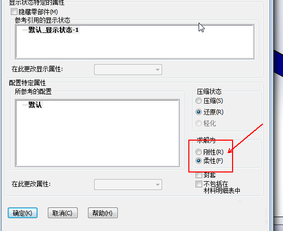 10、将装配体的属性由“刚性”改为“柔性”。这样就设置完毕,液压缸在装配体中可以实现推进运动了。