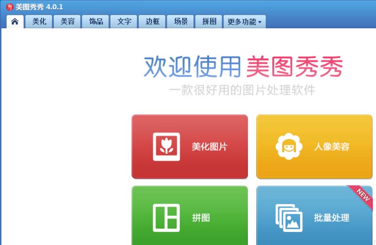 1、打开美图秀秀这款软件,进入美图秀秀的操作界面,如图所示: