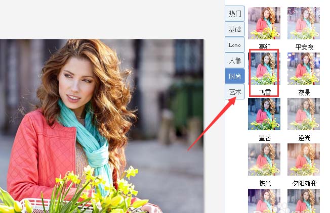 6、点击时尚选项,在其内找到飞雪选项,如图所示: