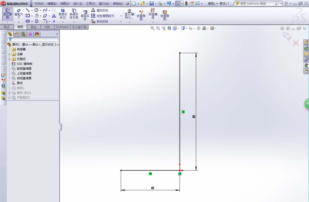 1、首先,在钣金模块随意画一个开放零件图。(我画的是80x40x2,取k因子0.45,折弯内半径R0.5)