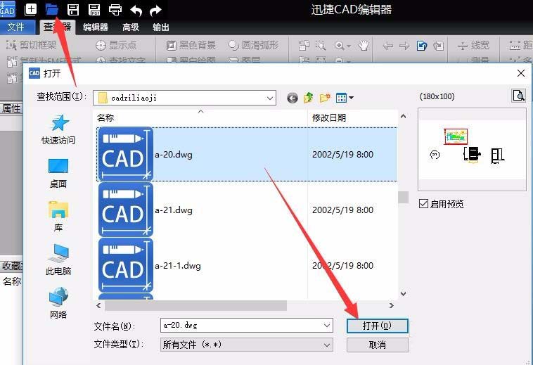 2、安装并运行任意一款CAd编辑器工具,点击“打开”按钮以选择相应的DXF图纸文档,并可以对其进行预览操作。