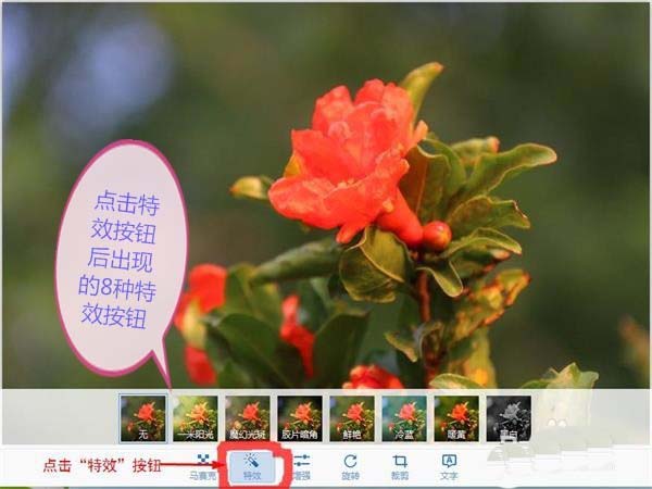 4、点击“特效”按钮,图片下方会出来“无”、“一米阳光”、“魔幻光斑”、“胶片暗角”、“鲜艳”、“冷蓝”、“暖黄”、“黑白”8种不同的特效按钮。