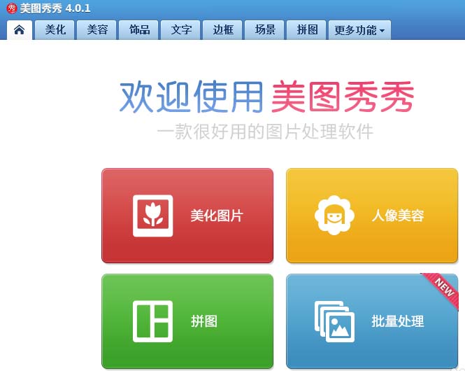 1、打开美图秀秀这款软件,进入美图秀秀的操作界面,如图所示: