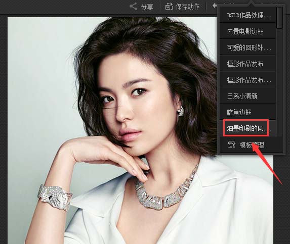6、点击模板选项,在其子级菜单里找到油墨印刷风格选项,如图所示: