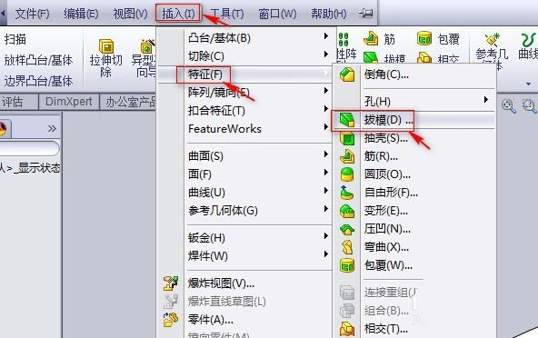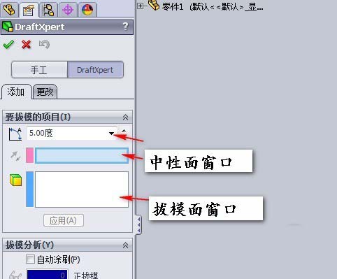 3、创建拔模特征1.依次选择菜单中的【插入】-【特征】-【拔模】命令,在拔模类型区域的下拉菜单中选择中性面选项,选取图示的模型表面作为中性面,选取圆柱面作为拔模面,在拔模区域输入拔模值5.0,调整拔模方向向下,单击勾号完成操作。