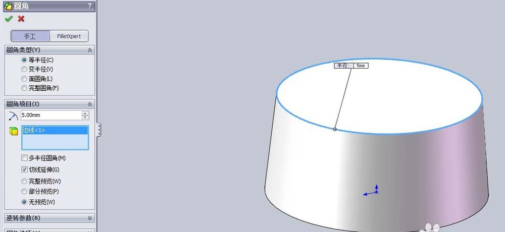 4、创建圆角特征1.选取边线为创作圆角的对象,输入圆角半径值5.0,单击勾号完成操作。