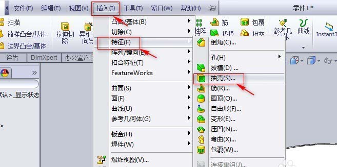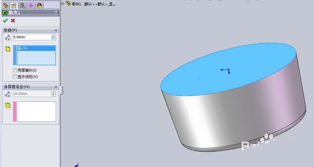 5、创建抽壳特征1.依次选择菜单中的【插入】-【特征】-【抽壳】命令,选取模型表面为要移除的面,在“抽壳1”对话框中的参数区域输入厚度值为3.0,单击勾号完成操作。