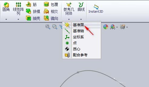 7、创建基准面1. 选择特征中的【创建几何体】-【基准面】命令,在系统弹出的“基准面”对话框中选取养条曲线和点作为参考实体,单击勾号完成操作。