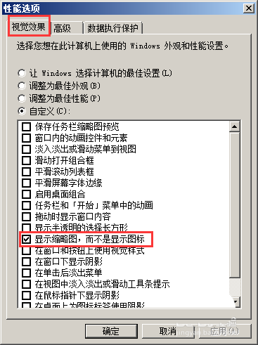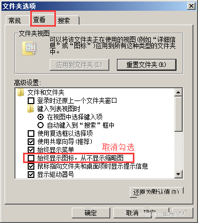 2、取消勾选“始终显示图标,从不显示缩略图”。