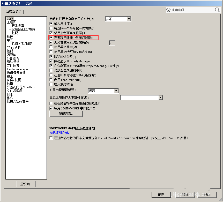 5、进入solidworks选项,勾选:在资源管理器中显示缩略图。