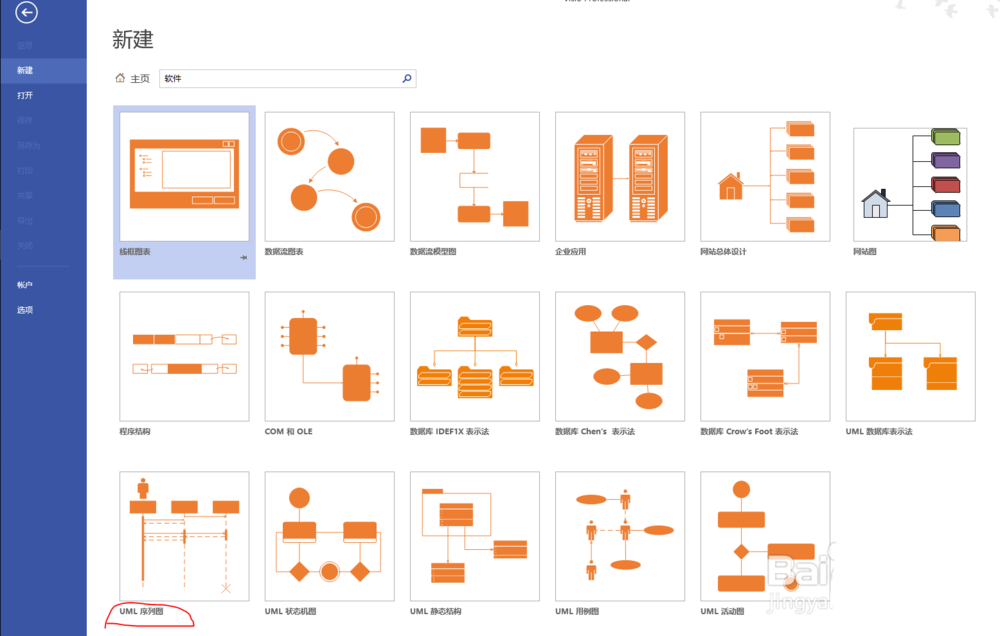 2、安装完成后打开visio,然后选择软件,之后你就可以看到有17种类型的图表,根据你的需求现在就可以选择创建了。这里我选择序列图。