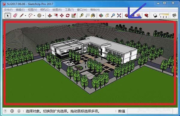 2、在进入的SU操作界面中将建筑模型调整成自己想要展示的角度1(详见下方图片红框内);