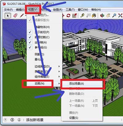 3、接着在SU操作界面左上方找到“视图”按钮,并依此点击“视图”→“动画”→“添加场景”按钮(详见下方图片红框内);