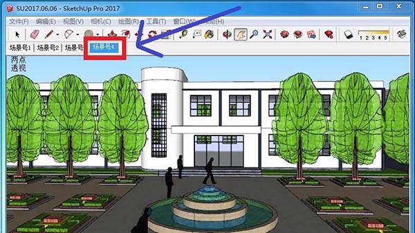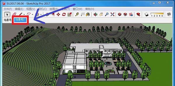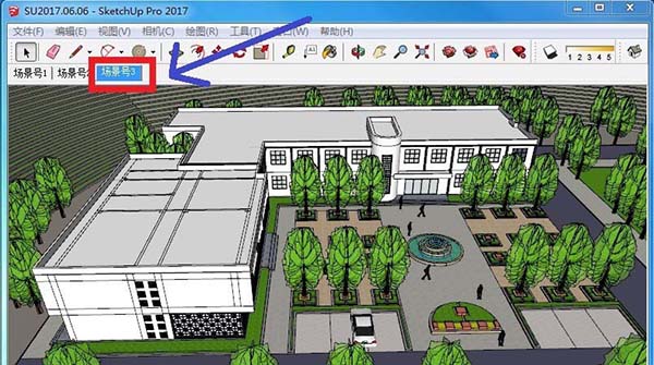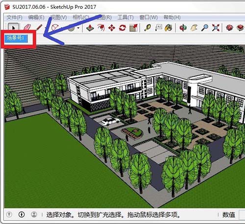 4、这时会在SU操作界面左上方生成一个“场景号1”的按钮(详见下方图片红框内),这个“场景号1”即对应着第2步中自己要展示的角度1;