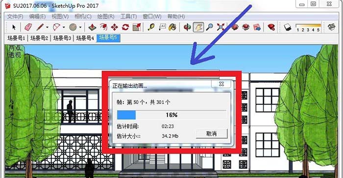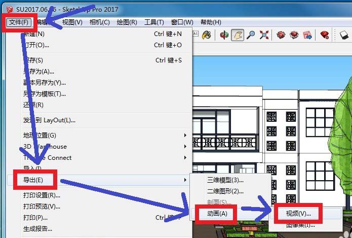 6、在设定好全部要展示的场景以后,接下来在SU操作界面左上方找到“文件”按钮,并依次点击“文件”→“导出”→“动画”→“视频”按钮(详见下方图片红框内);