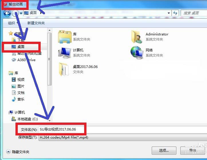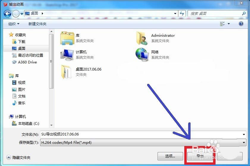 10、这时会返回到“输出动画”窗口,点击窗口右下方“导出”按钮即可进入“正在输出动画”界面,最后当动画输出100%后,即可在视频保存位置“桌面”上找到SU导出的视频了。