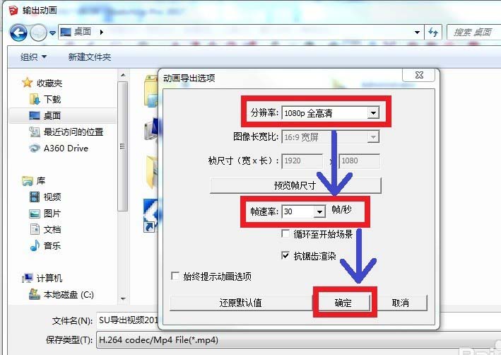 9、然后需要做的就是在“输出动画”窗口最下方点击“选项”按钮,弹出“动画导出选项”窗口,在这个窗口里将“分辨率”设置为“1080p全高清”,将“帧速率”设置为“30”,其他保持默认(详见下方图片红框内),接着点击“确定”按钮即可;